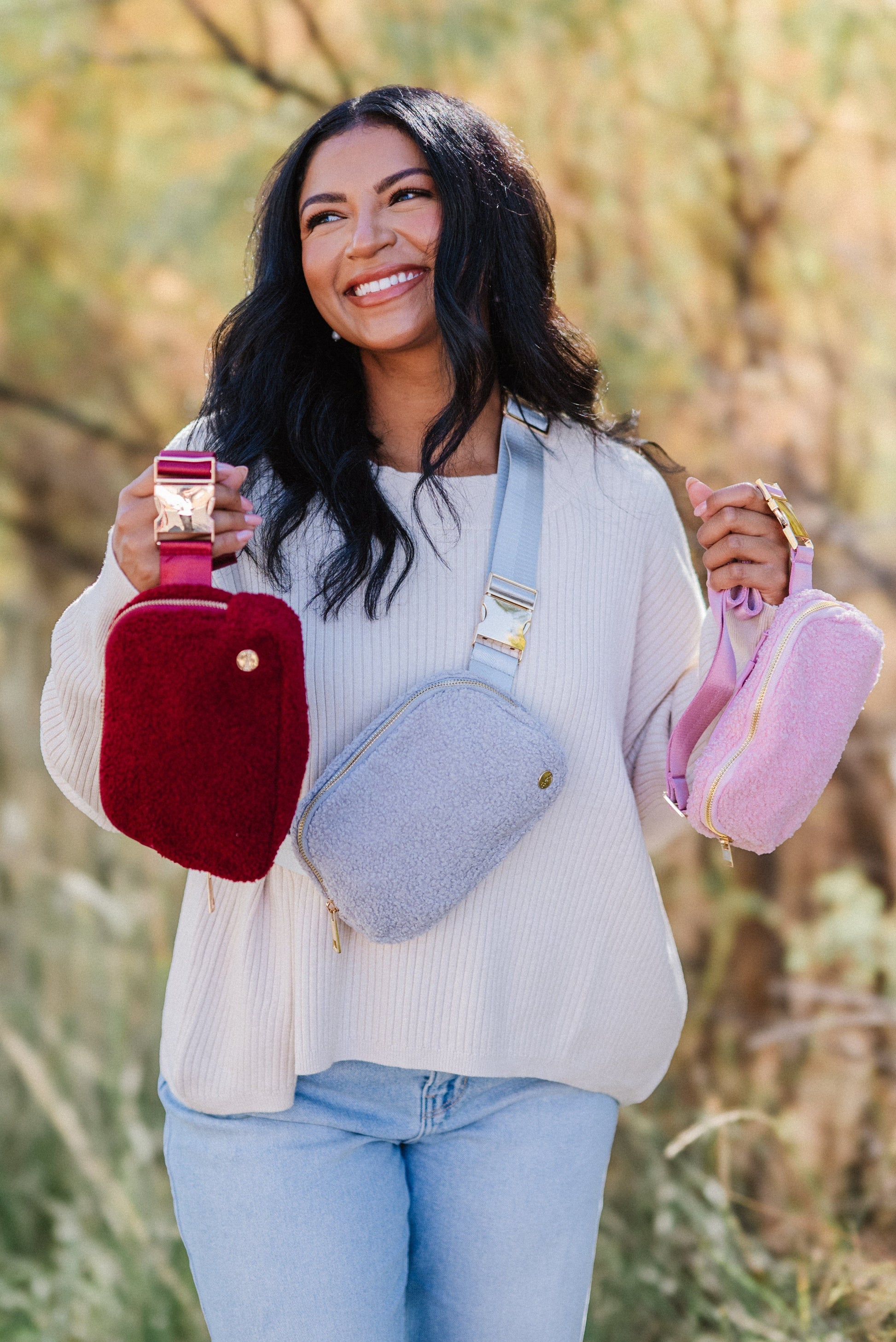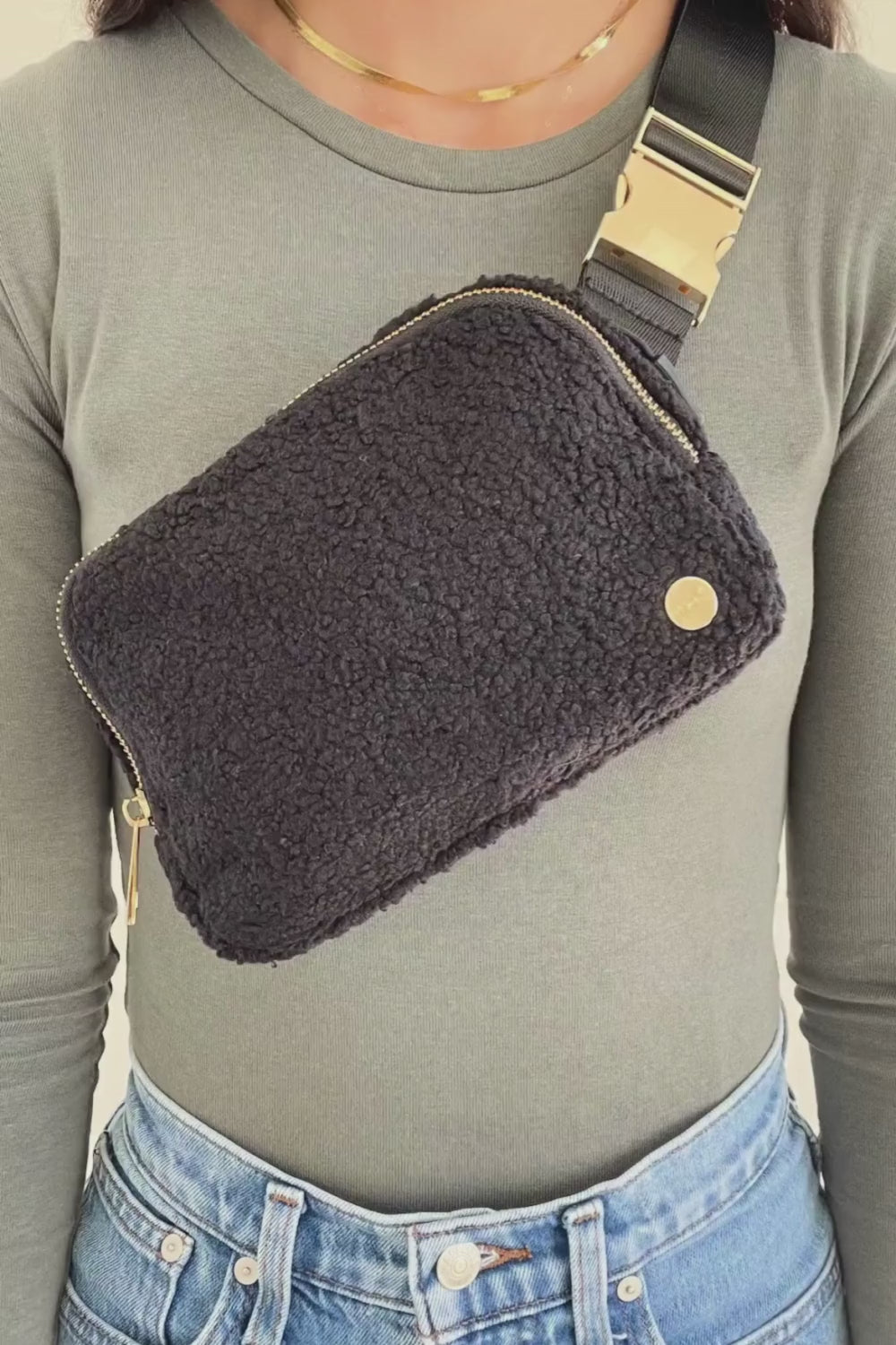A chill in the air calls for cozy accessories. Enter: The Aspen Sherpa Belt Bag. With its soft fleece material, adjustable strap (intended to fit over sweaters, vests, and coats), and glamorous gold hardware, you're sure to reach for this fanny pack all season long.